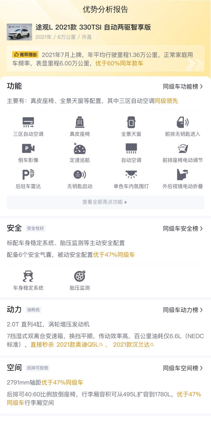 综上所述的新车含税价、用车成本、市场行情、优势分析、同款比价等数据仅供参考。在配置部分,因为二手车非标品,车辆可能会存在配置改装的情况,具体车况信息需要线下结合车辆实际情况进行综合参考。